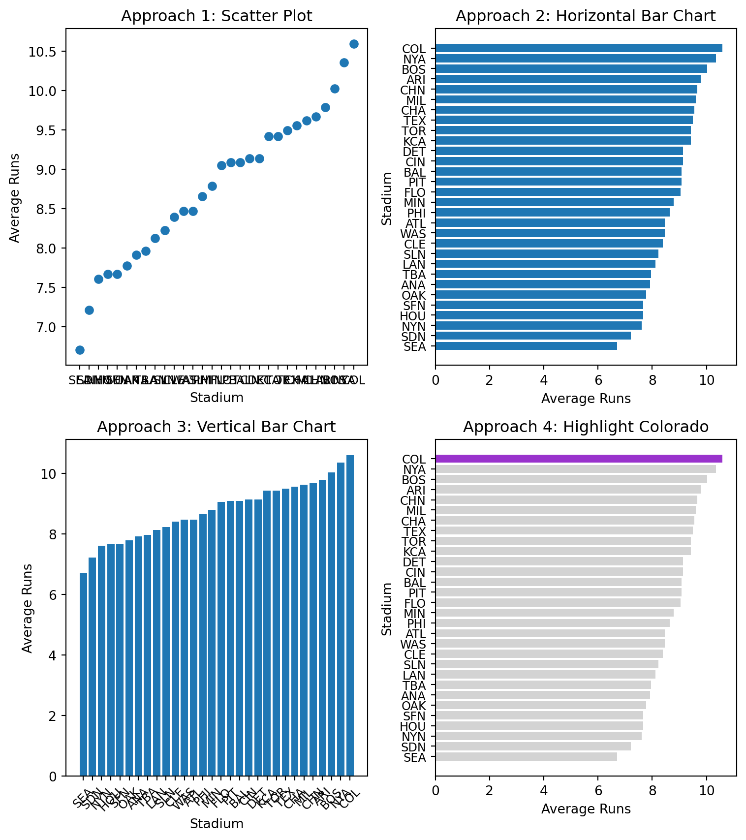 # Stage 3: Structuring of Visual Mappings# Explore different geometries and aesthetics# Sort data for better visualizationavgDF_2010_sorted = avgDF_2010.sort_values('totalRuns', ascending=True)# Create figure with subplots to compare approachesfig, axes = plt.subplots(2, 2, figsize=(8, 9))# Approach 1: Scatter plot (not ideal for categorical data)axes[0,0].scatter(avgDF_2010_sorted.home, avgDF_2010_sorted.totalRuns)axes[0,0].set_title("Approach 1: Scatter Plot")axes[0,0].set_xlabel("Stadium")axes[0,0].set_ylabel("Average Runs")axes[0,0].tick_params(axis='x', labelsize=9)# Approach 2: Horizontal bar chart (better for categorical data)axes[0,1].barh(avgDF_2010_sorted.home, avgDF_2010_sorted.totalRuns)axes[0,1].set_title("Approach 2: Horizontal Bar Chart")axes[0,1].set_xlabel("Average Runs")axes[0,1].set_ylabel("Stadium")axes[0,1].tick_params(axis='y', labelsize=9)# Approach 3: Vertical bar chartaxes[1,0].bar(avgDF_2010_sorted.home, avgDF_2010_sorted.totalRuns)axes[1,0].set_title("Approach 3: Vertical Bar Chart")axes[1,0].set_xlabel("Stadium")axes[1,0].set_ylabel("Average Runs")axes[1,0].tick_params(axis='x', rotation=45, labelsize=9)# Approach 4: Highlight Coloradocolorado_colors = ["darkorchid"if stadium =="COL"else"lightgrey"for stadium in avgDF_2010_sorted.home]axes[1,1].barh(avgDF_2010_sorted.home, avgDF_2010_sorted.totalRuns, color=colorado_colors)axes[1,1].set_title("Approach 4: Highlight Colorado")axes[1,1].set_xlabel("Average Runs")axes[1,1].set_ylabel("Stadium")axes[1,1].tick_params(axis='y', labelsize=9)plt.tight_layout()plt.show()