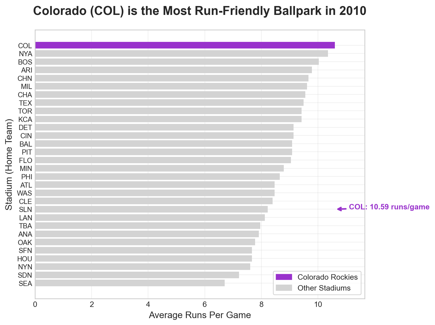 # Stage 4: Formatting for Your Audience# Create a professional, publication-ready visualization# Set style for professional appearanceplt.style.use("seaborn-v0_8-whitegrid")# Create the main visualizationfig, ax = plt.subplots(figsize=(8, 6))# Create color array for highlighting Coloradocolorado_colors = ["darkorchid"if stadium =="COL"else"lightgrey"for stadium in avgDF_2010_sorted.home]# Create horizontal bar chartbars = ax.barh(avgDF_2010_sorted.home, avgDF_2010_sorted.totalRuns, color=colorado_colors)# Add title and labelsax.set_title("Colorado (COL) is the Most Run-Friendly Ballpark in 2010", fontsize=16, fontweight='bold', pad=20)ax.set_xlabel("Average Runs Per Game", fontsize=12)ax.set_ylabel("Stadium (Home Team)", fontsize=12)# Add legendcolorado_bar = plt.Rectangle((0,0),1,1, color="darkorchid", label="Colorado Rockies")other_bar = plt.Rectangle((0,0),1,1, color="lightgrey", label="Other Stadiums")ax.legend(handles=[colorado_bar, other_bar], loc='lower right', frameon=True)# Add annotation for Coloradocolorado_index = avgDF_2010_sorted[avgDF_2010_sorted.home =="COL"].index[0]colorado_runs = avgDF_2010_sorted[avgDF_2010_sorted.home =="COL"]["totalRuns"].iloc[0]ax.annotate(f"COL: {colorado_runs:.2f} runs/game", xy=(colorado_runs, colorado_index), xytext=(colorado_runs +0.5, colorado_index), arrowprops=dict(arrowstyle='->', color='darkorchid', lw=2), fontsize=10, fontweight='bold', color='darkorchid')# Set x-axis to start from 0 for better comparisonax.set_xlim(0, max(avgDF_2010_sorted.totalRuns) *1.1)# Smaller font for stadium (y-axis) tick labelsax.tick_params(axis='y', labelsize=9)# Add grid for easier readingax.grid(True, alpha=0.3)plt.tight_layout()plt.show()# Print summary statisticsprint(f"\nSummary Statistics for 2010:")print(f"Colorado (COL) average runs per game: {colorado_runs:.2f}")print(f"League average runs per game: {avgDF_2010_sorted.totalRuns.mean():.2f}")print(f"Colorado is {((colorado_runs / avgDF_2010_sorted.totalRuns.mean()) -1) *100:.1f}% above league average")