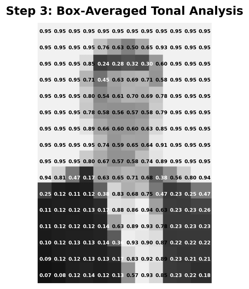 Create a tonal analysis by dividing the image into a grid and computing average brightness in each section. This visualizes the distribution of tones and helps identify which brightness ranges are most important.